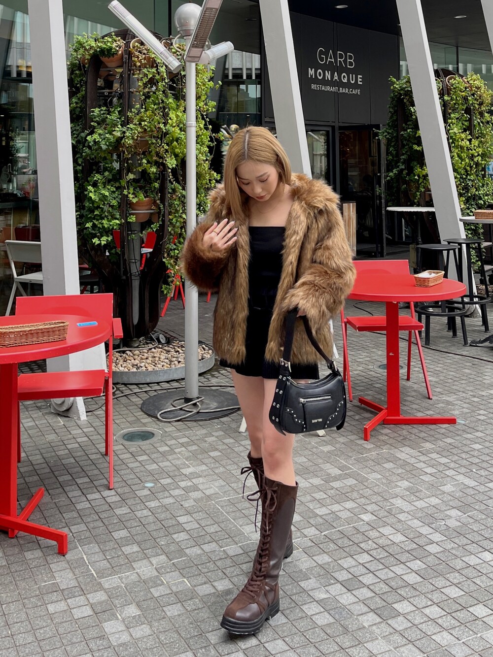 【outer】 大バズり中のファーコート♡156cm/FREE着用。フロントにフォックが付いているので閉めることできます◎襟も立てれるのでマフラーいらずです! 【pants】 MURUAで大人気のニットパンツ♡細見え効果抜群です!オールシーズン着用可能。156cm/FREE。 【shoes】 トレンドのレースアップロングブーツ♡高低差がなくスニーカーのような感覚で着時間着用していただけます!24.0cm,甲高,幅広の私で24.5cm着用。