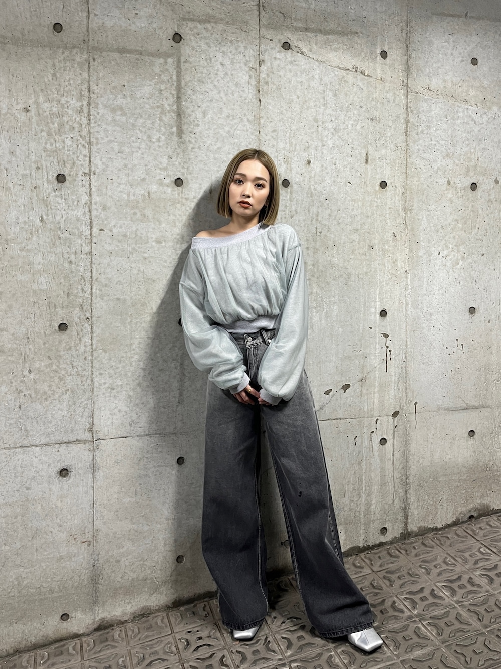 【tops】 チュールがレイヤードされたトップス♡首元をずらしてクルーネックにもワンショル風にも着用できます! 【denim】 MURUA定番の美シルエットのデニムがバージョンアップして登場♡グラデーションデザインがポイント!156cm/S着用。