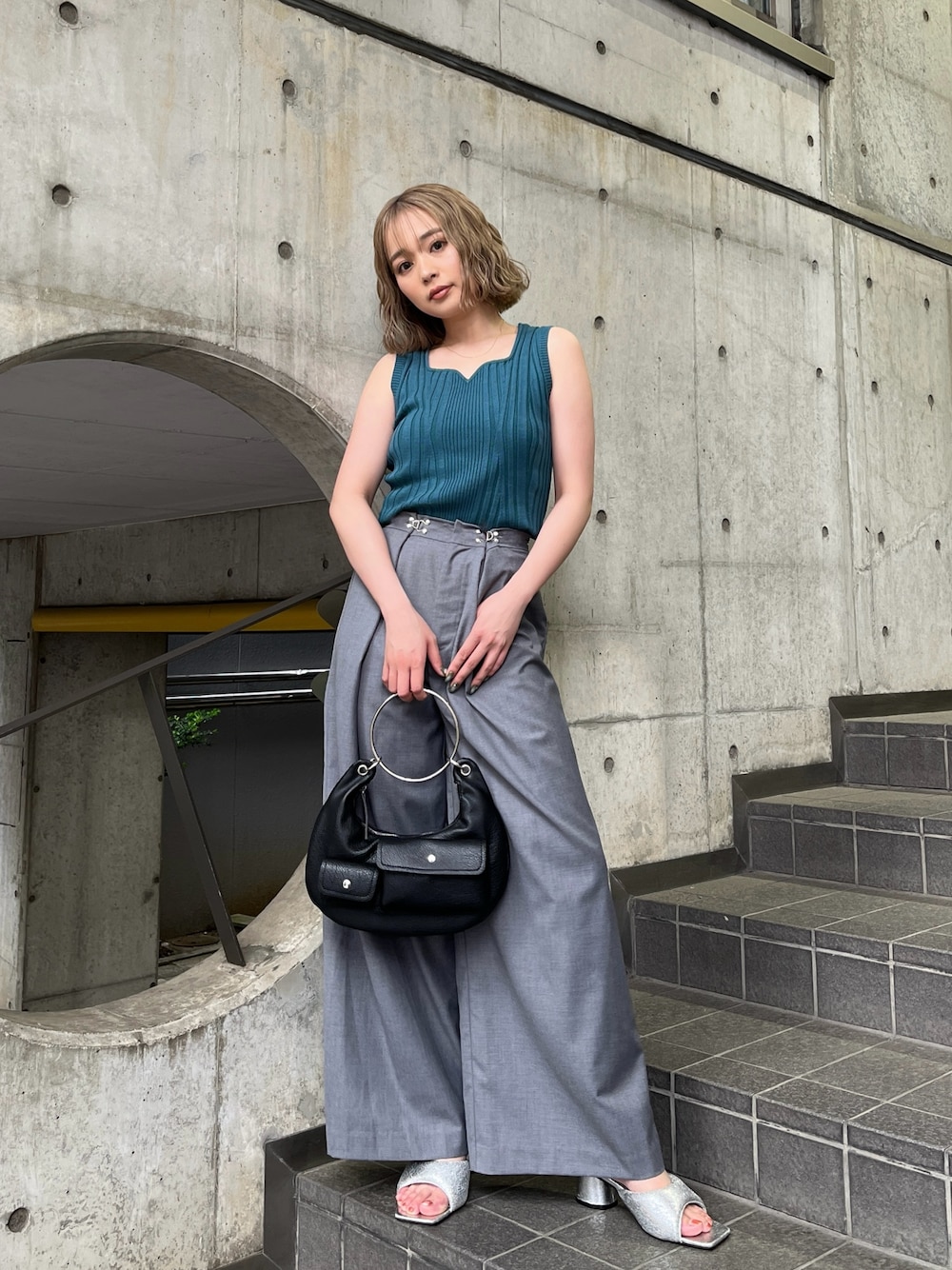 【tops】 2way仕様のタンクトップ♡ 【pants】 ウエストホックのデザインがポイントのワイドパンツ♡ホックの位置でウエスト調整可能です!156cm/S 【shoes】 クッション性のあるキラキラデザインがポイントのミュール♡24.0cm,甲高,幅広の私で24.5cm着用。