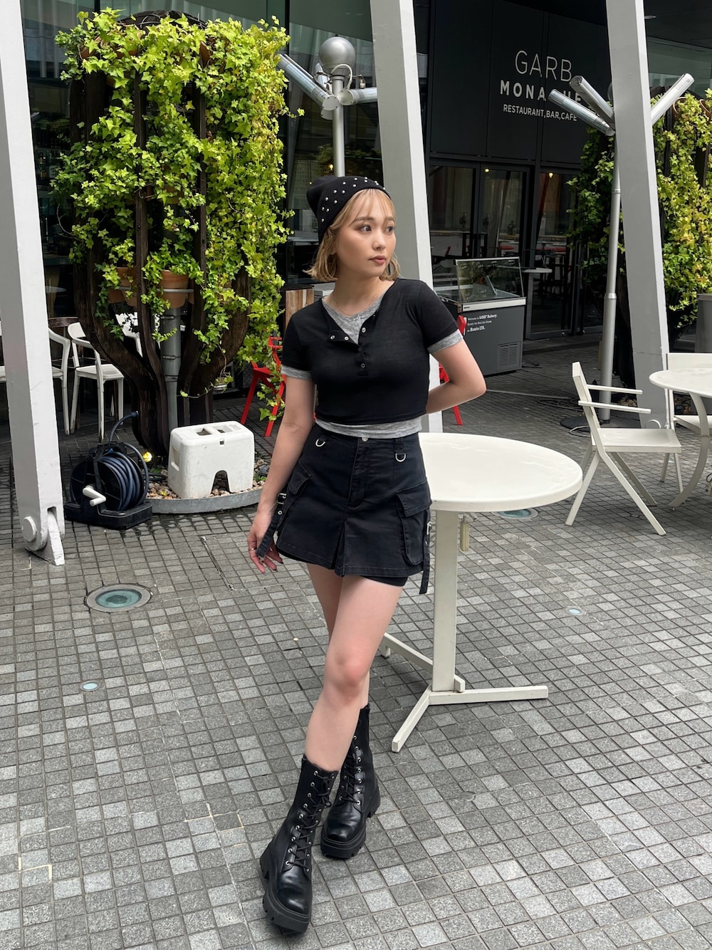【tops】 レイヤードデザインがポイントのトップス♡生地薄めなので真夏も涼しく着用できます! 【skirt】 カーゴデザインのミニスカート♡パンツ付きなので安心感抜群です!(156cm/S)