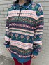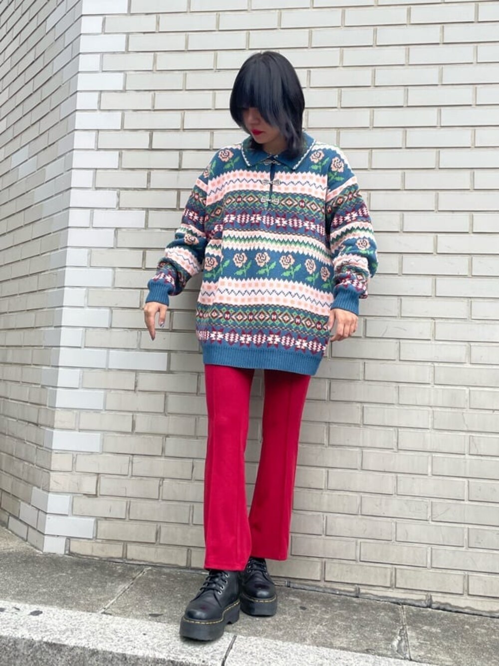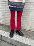 他にはないデザインのニットが主役のスタイリング。 配色とデザインがしっかりしているのでシンプルなボトムス合わせや1枚で着るのがおすすめです! 襟元のボタンもポイントです。 センタープレスのフィットパンツは従来のデザインよりも短めなので高身長さんはブーツ合わせがおすすめです◎