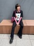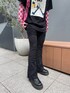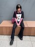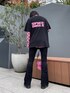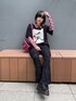 黒のtシャツとパンツにピンクのシースルーシャツとバッグを合わせた春っぽブラックコーデ🖤 フィットパンツは程よいフレアシルエットでスタイルアップ効果抜群です🙆♀️