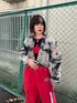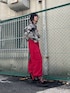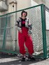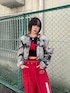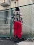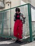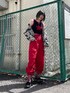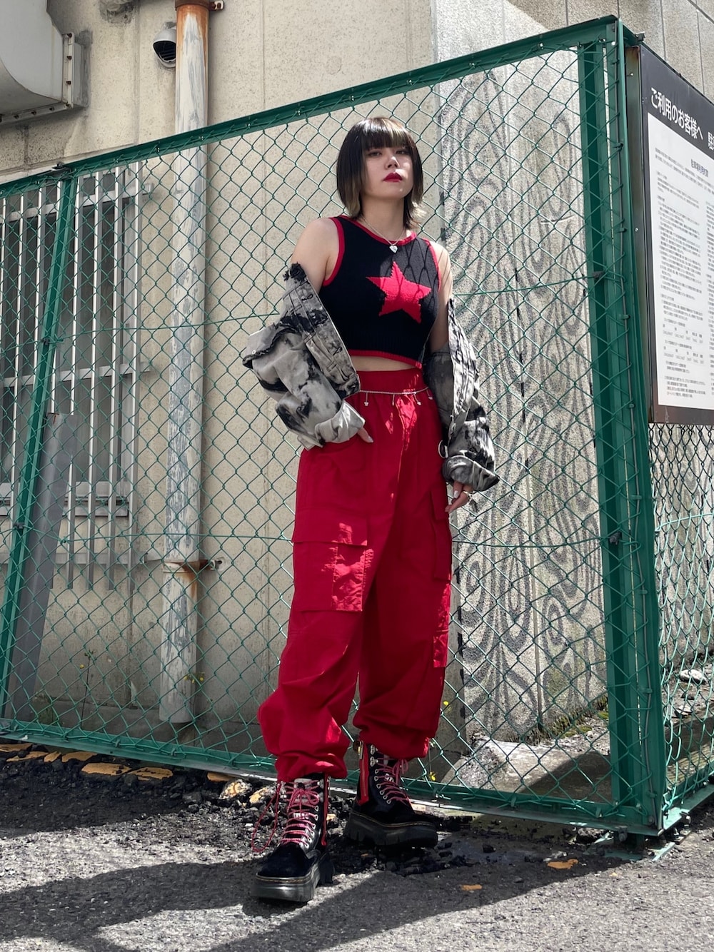 赤色のカーゴパンツが目を引くストリートコーデ❤️ タイダイ柄のデニムジャケットとニットタンクを合わせてハードでスタイリッシュな印象に!