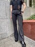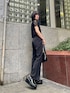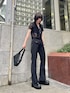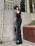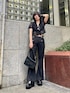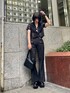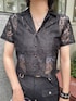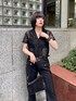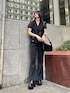 スラックスパンツとレースシャツを合わせた大人ブラックコーデ🖤 小物も全部ブラックで統一し、さらに引き締まったスタイリッシュなコーデに! インナーをあえてスポブラにしてスポーティーさをプラスし外してみました! レースを取り入れた夏にこそ楽しめるブラックコーデ🔥