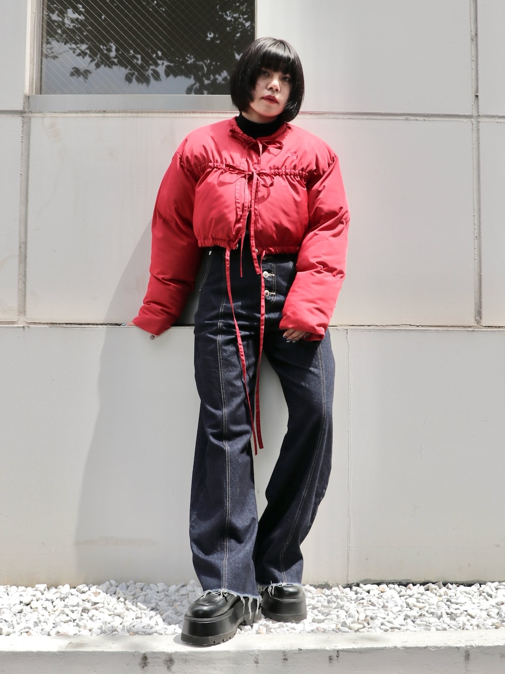 レッドカラーのリボン付きギャザーダウンでトレンド感満載のカジュアルコーデ🌹 【ダウン】 トレンドのリボンディティールでバレエコア要素を取り入れたパッファーコート🎀 ショート丈のアウターはどんなボトムスにもすっきりと合わせやすく、取り入れるだけで一気に旬な見え感になります。 さりげない刺繍もこだわりのポイントです! 【デニム】 ジャパンデニムブランド『 Something』と『Postokyo』のコラボレーションアイテム! ストレートセミワイドシルエットのデニムパンツ👖 ウエストの上端を切りっぱなしたような加工でラフな印象をプラス! バックにはウエストサイズ調整可能なベルト付きで、スタイリングによって履き位置を変えられます✨ オリジナル刺繍や、色によって違う皮パッチやステッチもポイント🫶 【シューズ】 スクールムードを演出してくれるブリティッシュなオックスフォードブーツ❣️ jouetieらしいぽってりとした厚底デザインで、コーディネートを今季らしくプラッシュアップしてくれます。