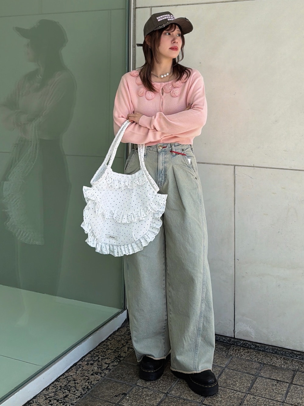 【お花見コーデにピッタリの大人カジュアルコーデ】 【カーディガン】 ローズモチーフがトレンド感満載のニットカーディガン🌹 サマーニットでサラッと着心地抜群です! 【デニム】 大好評のSOMETHINGコラボ! 素材は米綿でVINTAGE感あふれる、オーセンティックデニム! 太めのタテ糸を使用することで加工感とハリ感が出るので、しっかりとしたホールド感があるのが特徴です。 身長161センチでSサイズがジャスト丈です。 【bag】 ドット×フリルの甘めデザインは今季春夏にピッタリのデザインです💖 中はナイロン生地でしっかりとしており実用性抜群!! 【キャップ】 スタッズとダメージ加工で少し辛めな印象ですが、ふっくらと立体感のあるロゴデザインで強くなりすぎないようにしているのがポイント🫶 【ネックレス】 カジュアル、辛めなコーデにパールを合わせるとバランスが取れるのでカジュアルなお洋服が増える春夏重宝するデザインです!