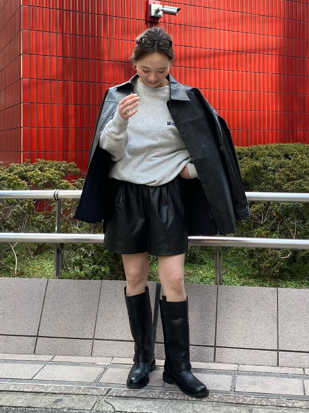 【アウター】 柔らかい生地感で羽織りやすいレザーシャツ🐦⬛ 中にパーカーを入れるスタイリングもおすすめです😌❤️ 【スウェット】 表の刺繍のロゴとバックデザインがポイントのスウェット🙂↕️ 生地も柔らかく着やすいです🙆♀️ 【パンツ】 丈も短すぎず長すぎずなレザーのショートパンツ🐦⬛✨ ゆったり目なシャツ合わせもおすすめです🙆♀️ 【ブーツ】 長時間歩いても痛くならないロングブーツ👢 普段23.5㎝を履いており、今回Mサイズを着用しております!