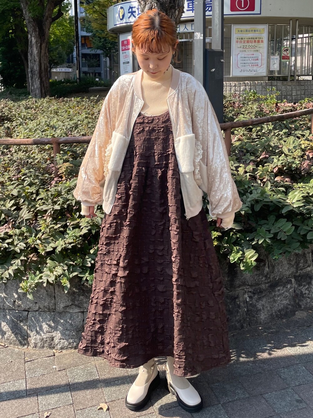 ブラウンコーデ🍂 【トップス】 着回しやすいカラーのリブニットは、メロウの刺繍がアクセントに❣️秋冬のレイヤードに欠かせない1枚です。 【ワンピース】 ぽこぽこ立体的な生地が個性的なキャミワンピ!ゆとりのあるサイズ感で、さまざまなレイヤードが楽しめます🤍 肩紐のアジャスターで、丈感の調整も可能◎ 【ブルゾン】 異素材をたっぷり組み合わせた個性的で可愛いブルゾン🤍 オーバーサイズですが着丈は短めなので、スタイルアップ効果も◎ 袖が大きめのニットと合わせてももたつかないサイズ感で、冬まで着回せるのもポイントです。 【ブーツ】 ソックスを組み合わせたようなドッキングブーツ🥾 ニット素材で柔らかく、フィット感抜群なので長時間のお出かけにも◎