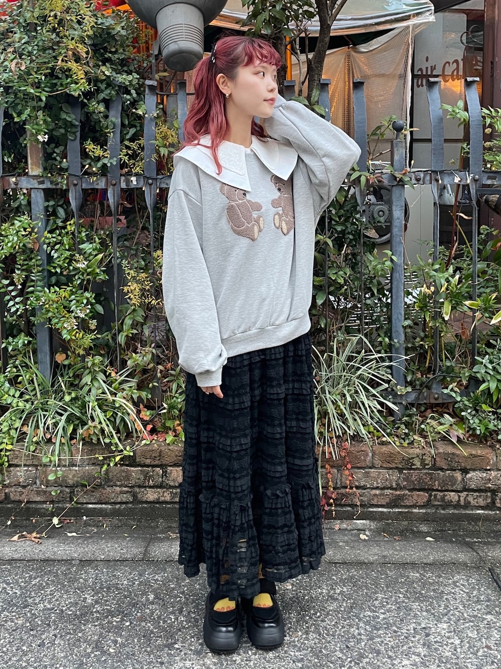 カジュアルガーリーコーデ🐻 【ブラウス】 2枚重ねの襟がポイントのブラウスは、レース生地で上品な雰囲気に◎ 【スウェット】 もこもこのくまさんが並んだ可愛らしいスウェット🧸 ゆるっとシルエットで、カジュアルにもガーリーにも着回しやすい1枚です。 【スカート】 小花柄のレースが華やかなスカート。 カットソー素材なのでガーリーすぎず、様々なコーデに合わせやすい1枚です🤍 更にお手入れ楽ちんなのも嬉しいポイント! 【シューズ】 フリルとボリュームのあるソールの組み合わせが可愛らしいスニーカー👟✨ 軽くて歩きやすいので、長時間のお出かけにもぴったり!