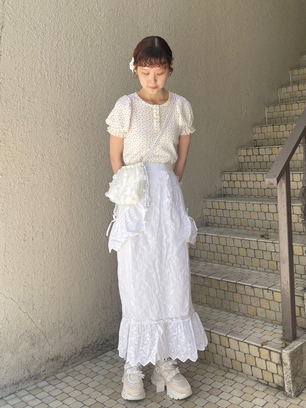 【トップス】 優しい肌触りの柔らかい素材を使用しているので、パフスリーブでも肩幅を気にせず着用していただけます◎ コンパクトなサイズ感で、レイヤードにも重宝する1枚。 【スカート】 コットンレースが春夏らしいスカート。 体のラインを拾わないサイズ感で、すっきりと着こなせます。 【バッグ】 ころんとした丸みのあるシルエットが可愛らしいポシェット。 お花のデザインが春夏らしい🌸 【シューズ】 今期イチオシのスニーカー🎀 リボンやお花刺繍のチュールに、カジュアルなスニーカーソールを組み合わせた、さまざまなコーデに馴染みやすい1足。 23.5㎝でMサイズ着用です。