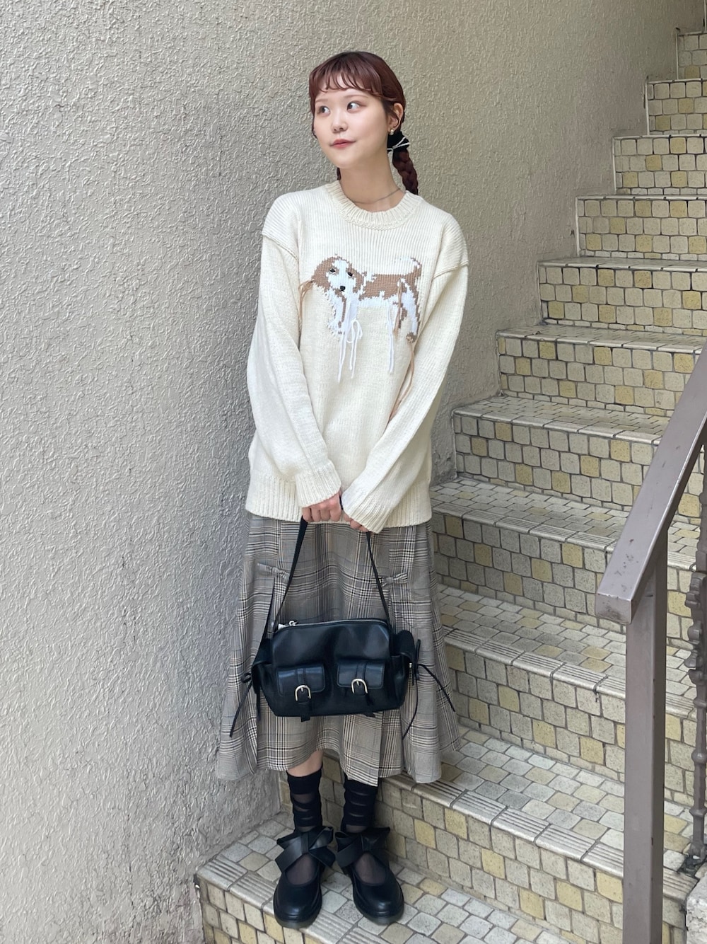 【トップス】 ヴィンテージライクなわんちゃんのニット🧶 ゆとりのあるルーズなサイズ感で、カジュアルめなスタイリングにぴったり! ゆるっと垂れた糸は、ランダムにリボン結びするのがおすすめです🎀 【スカート】 秋冬らしいカラーが魅力のスカート! トレンド感のあるミディ丈を生かして、デザイン性のあるソックスやショートブーツなどとの合わせもおすすめです♡ 【バッグ】 秋冬にぴったりなマット素材のショルダーバッグ👜 マチ付きでたっぷり収納◎ かっちりしがちなショルダーバッグも、丸みのある形やリボンモチーフでmerry jennyらしいガーリーな印象に♡ 【シューズ】 大人気のシューズが復刻♡ ソックス合わせも楽しい、秋冬らしさたっぷりの1足です🎀