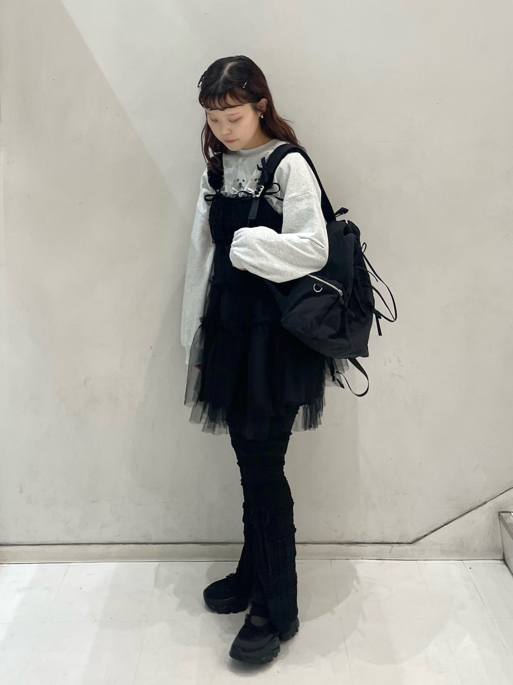 (スウェット) ふわふわのワンちゃんが並んだビッグシルエットのスウェット🐶 そのままの着用はもちろん、ワンピースやブラウスなどのレイヤードにも重宝します⚪︎ (ワンピース) トレンド感のあるチュールをフリルたっぷりで飾ったキャミワンピ。 ウエストと肩紐がドロスト仕様になっており、お好みのシルエットで着用できます⚪︎ インナー次第でオールシーズン着回し可能⚪︎ さらに、インナーによってカジュアルめにもガーリーにも着こなせる万能アイテムです♡ (パンツ) 様々なレイヤードに活躍する人気のパンツ♡ ミニ丈とのレイヤードでこなれ感! フレアシルエットで脚長効果も◎ (リュック) たっぷりギャザーとリボンが可愛らしいバッグパック🎒 しっかり大容量で、デイリー使いしやすいアイテムです。 (シューズ) 取り外し可能なレースアップリボン付きのスニーカー🎀 カジュアルなコーデにも馴染みやすい厚底デザイン! 軽くて歩きやすいので、長時間のお出かけにも◎