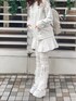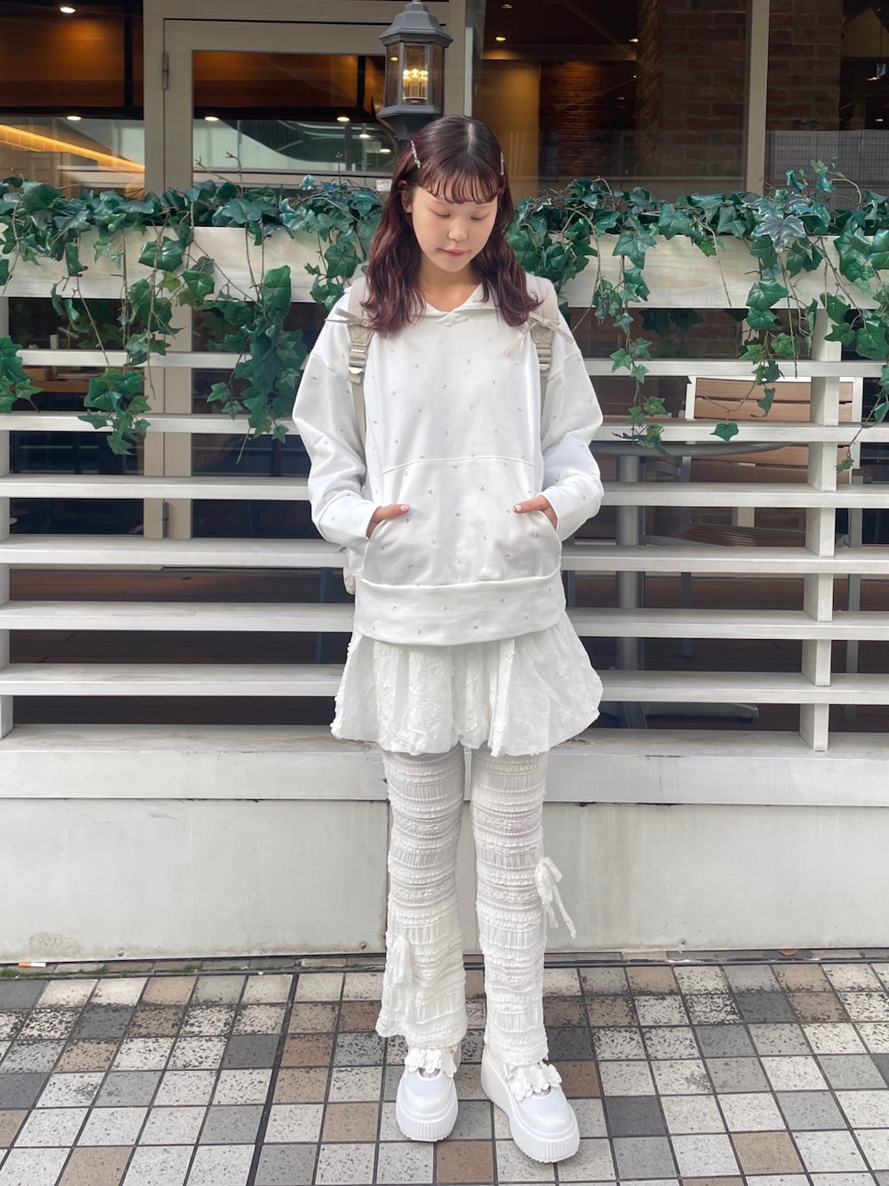 (スウェット) カジュアルな印象になりがちなスウェットも、セーラーカラーと小花柄のデザインで春らしくガーリーに☘️ 体のシルエットを拾わないゆるっとしたサイズ感。 やや厚みのあるしっかりした生地で、ホワイトでも透けにくくなっています⚪︎ (スカート) お花の立体レースが華やかなバルーンスカート🎈 1枚での着用はもちろん、パンツ合わせもおすすめ。 (パンツ) 様々なレイヤードに活躍する人気のパンツ♡ ミニスカートとのレイヤードでこなれ感! フレアシルエットで脚長効果も◎ (リュック) たっぷりギャザーとリボンが可愛らしいバッグパック🎒 しっかり大容量で、デイリー使いしやすいアイテムです。 (シューズ) お花モチーフがかわいいメッシュスニーカー🌼 カジュアルになりすぎないデザインで、甘めのコーデにもマッチします。