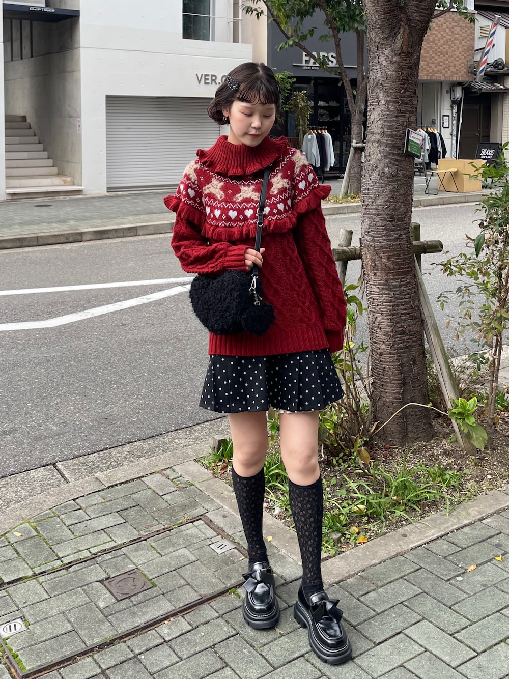 (トップス) 秋冬らしいカラーバリエーションのニット🧶 タートルのフリルで顔周りも可愛らしく、暖かく⚪︎ くまとハートのデザインがコーデのポイントになります。 (スカート) ウエストすっきりめで、フレアなプリーツが細見え!⚪︎ トレンドのドットデザインを手軽に取り入れられます。 (バッグ) 人気のバッグから、秋冬らしいファーデザインが登場! マチ付きで大容量なのもポイントです。 (シューズ) 大きなリボンがポイントのローファー。 軽くて歩きやすいのに、しっかり厚底でミニ丈との相性抜群です⚪︎
