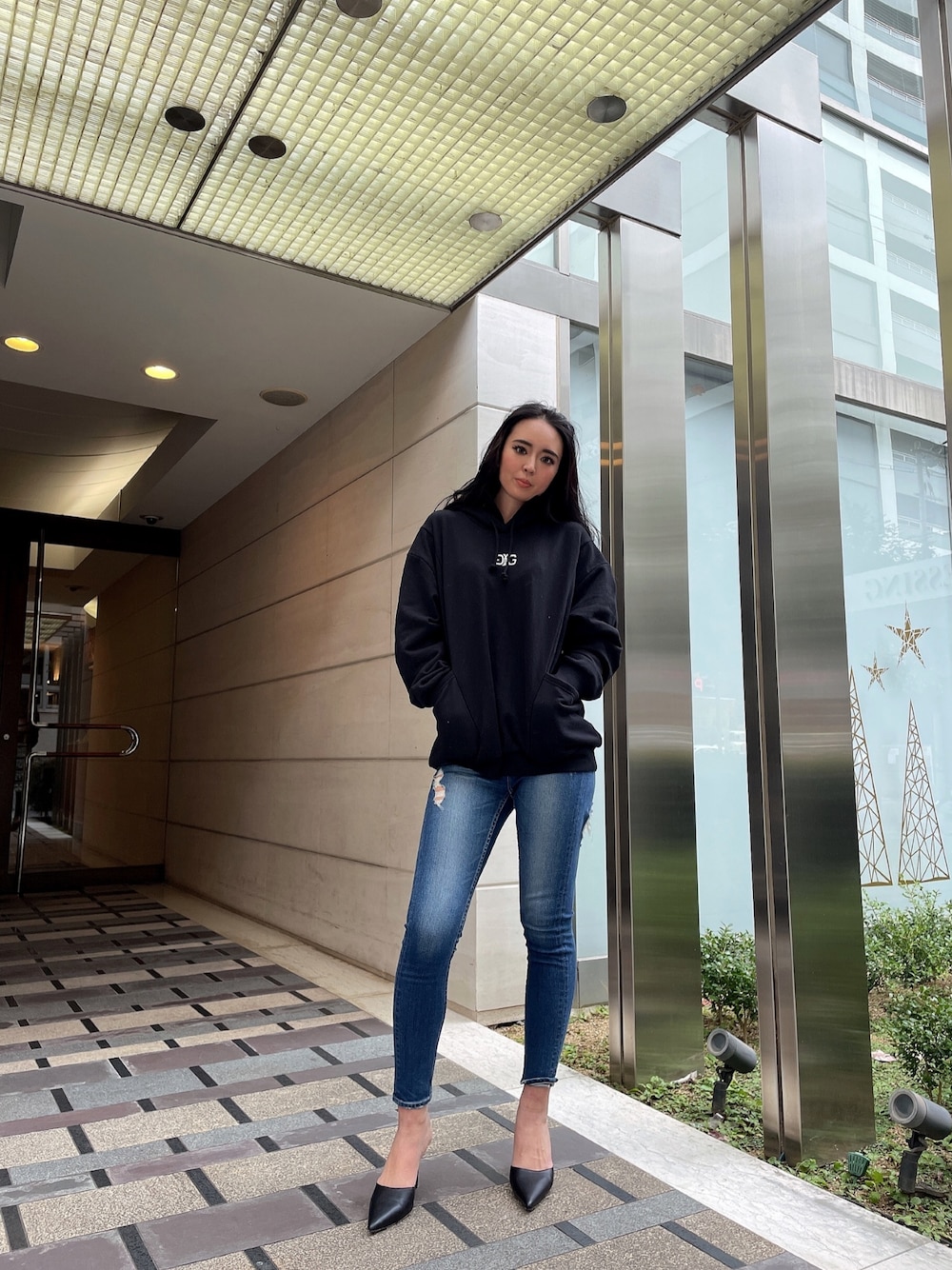 《カジュアルお洒落コーデ》 【tops】衿がレイヤード風になっているスウェットパーカー🖤ポケットもあえて表側に付いているのもポイントで、裾側がボリュームシルエットになることで太ももの細見え効果も抜群です◎ 【pants】GYDA(ジェイダ) M/W BOTH RIPPED スキニーデニムパンツ! GYDAらしさ溢れるデザインのスキニーデニムになり、太もも裏のダメージ加工がポイントです✨【shoes】通年大人気のGYDAポインテッドミュール!シンプルなデザインでどのデニムでも合わせることができ、足元をお洒落に見せてくれる超万能アイテム‼️