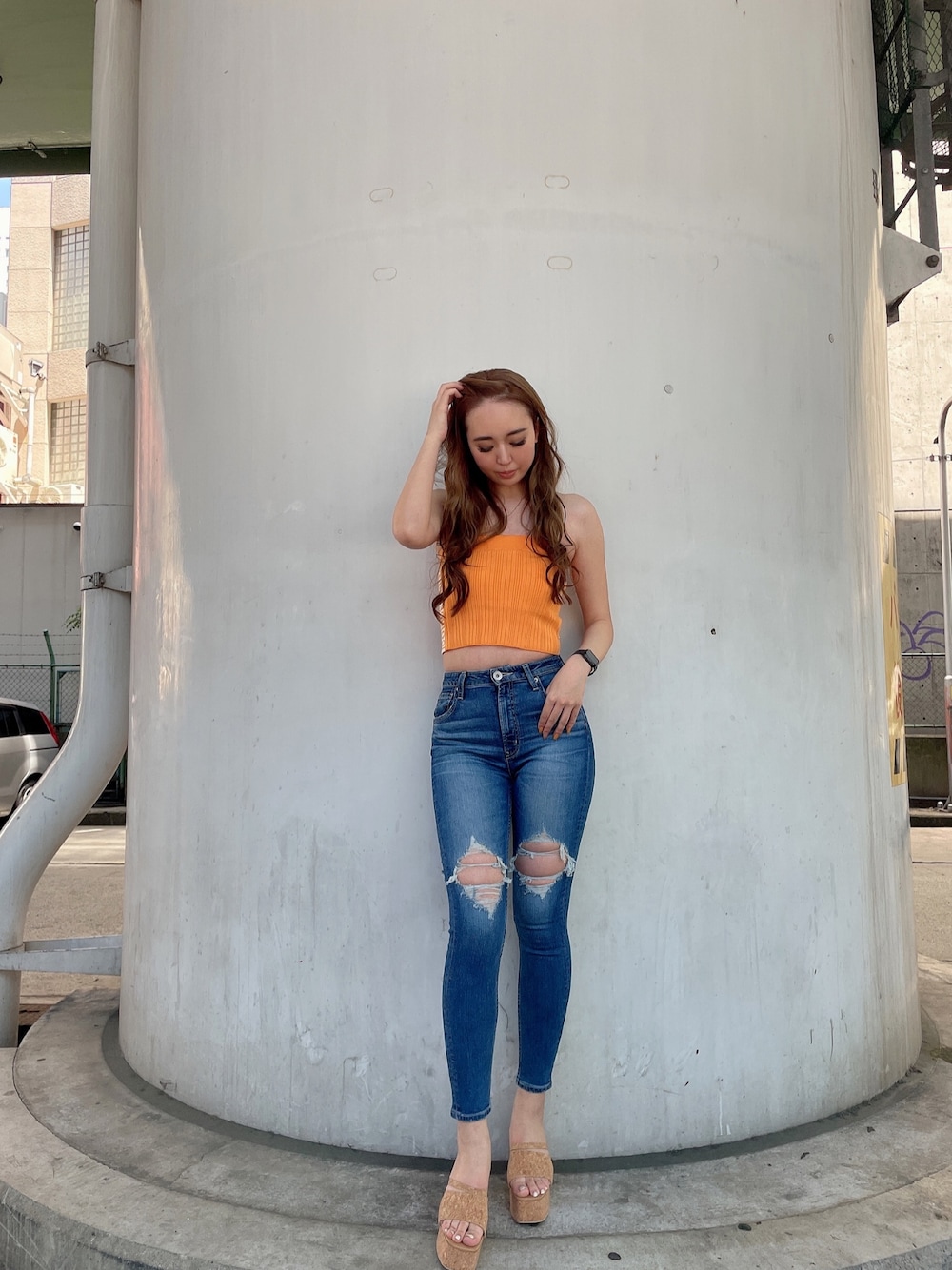 《夏のGYDA肌見せコーデ》 【tops】サイドにロゴが入っているベアサイドジャガードニットtops🧡 パットがしっかり付いているのでずれにくく、一枚でもインナーとしても大活躍するアイテムです✨【pants】 GYDA MADE IN JAPAN 👖両ひざに入った大き目のダメージを少し上目に入れ、視覚で膝下を長く見せれるようにしているのがポイント◎ハイウエストで腰位置も高く見えるので脚長効果も抜群のおすすめデニムです❤︎【shoes】毎年大人気のコルクサンダル👡つま先部分はスクエアでモードな雰囲気でこれからの季節大活躍間違いなしの超万能アイテム✨