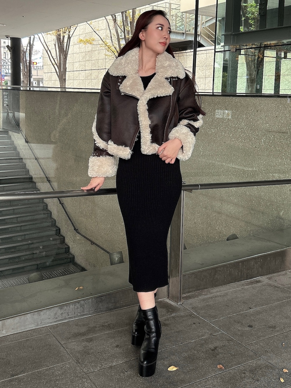 【outer】トレンド感たっぷりのエコムートンライダース❤︎ ボリューム感がありながらもショート丈でバランスよく、スタイルアップも叶えてくれるシルエットのアウター❤︎ 袖からバックに繋がるボアラインや、袖口のベルト付きで袖のボリューム調整も可能です◎ 【shoes】 通年大人気のチャンキーショートブーツ✨ 細めのシルエットでワンピースのほかデニムも相性抜群です❤︎足のサイズ25cmの私でLサイズでぴったりでした❤︎高めヒールで厚底なので脚長効果も叶えてくれるおすすめブーツです✨