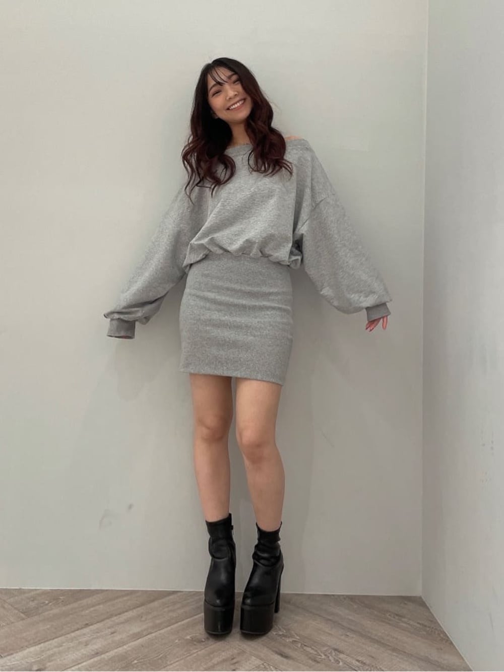 arisa(GYDA)のワンピース「ドッキングオフショル スウェットワンピース」を使ったコーディネート