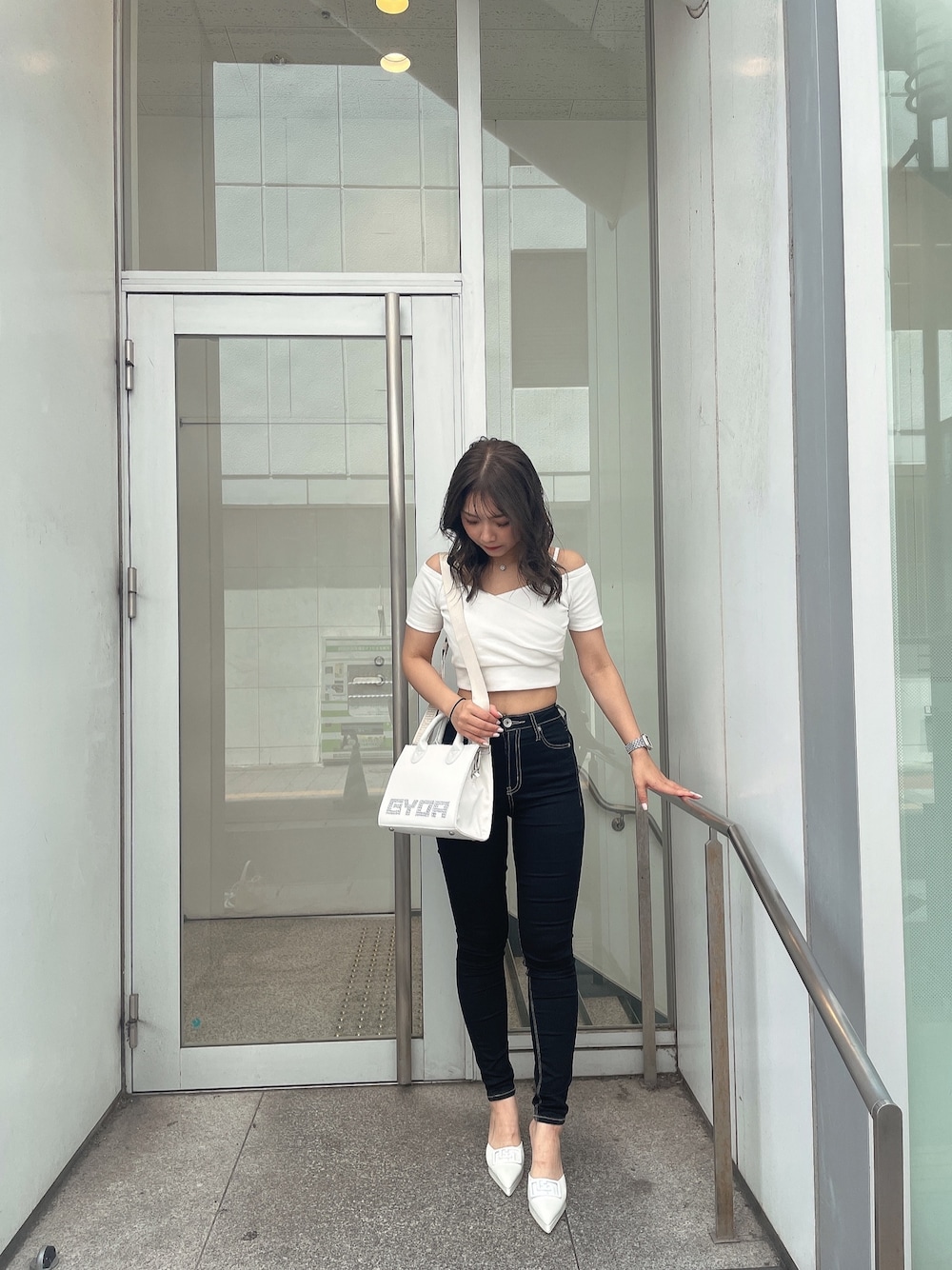 arisa(GYDA)のTシャツ/カットソー「ハーフスリーブカシュクールオフショルショートTOPS」を使ったコーディネート