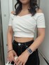 モノトーンコーデ♡ カシュクールオフショルトップスはデコルテを綺麗に出してくれて、二の腕を隠してくれる神デザイン✨ ショート丈なのでハイウエストボトムとの相性⭕️です。 ボトムスの合わせで綺麗目も、カジュアルコーデどちらも組めるので一枚持っておくべき重宝アイテムです!