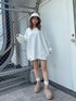 ホワイトコーデ♡ 【トップス】 オーバーサイズのトップスなので低身長の方はワンピ風合わせがオススメ♡ 立体感のあるロゴがポイントデザインです。 スウェットですが素材感がラフになりすぎず綺麗め合わせもできます! 【ブーツ】 トレンドのムートンブーツです。 程よい厚底感で身長も盛れてヒールがないので長時間歩いても足への負担もないです。 23.5センチでMサイズが丁度いいサイズ感です。 【帽子】 トレンドのシャギー素材のバケハです。 つばが広めのデザインなので小顔効果抜群です♡