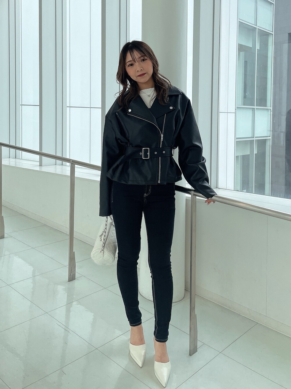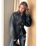 arisa(GYDA)のライダースジャケット「ペプラム フェイクレザー ライダースジャケット」を使ったコーディネート