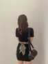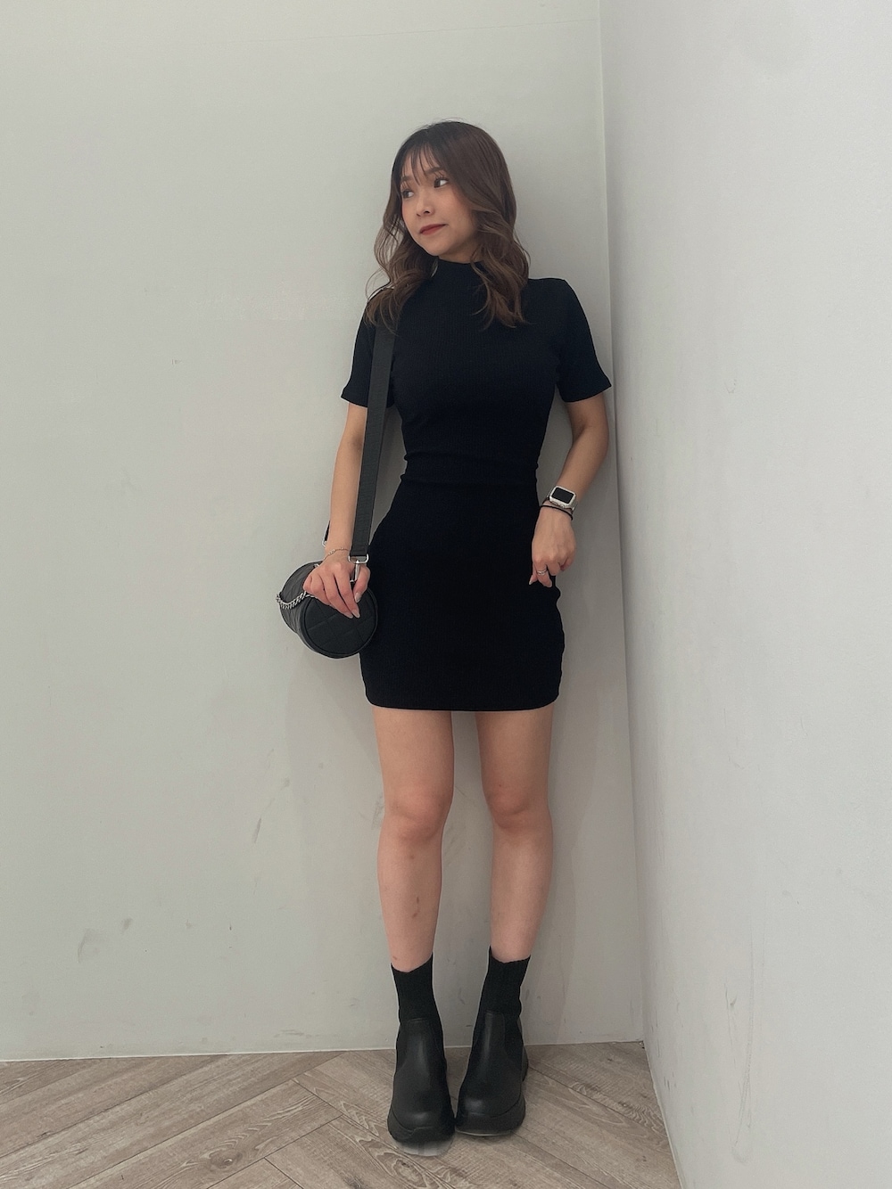 ワンピコーデ 【ワンピース】 毎年大人気のバックリボンワンピ♡ ウエストにリボンがついているのでくびれて見えてスタイルアップできるワンピースです。 【ブーツ】 ソックス素材のブーツなので柔らかく履きやすいです。デザインもシンプルなのでワンピや、スキニーデニム合わせもオススメです。23.5㎝Sサイズ着用 【バック】 キルティングがポイントのトレンドの丸いバックです。紐も2wayでご使用いただけます。