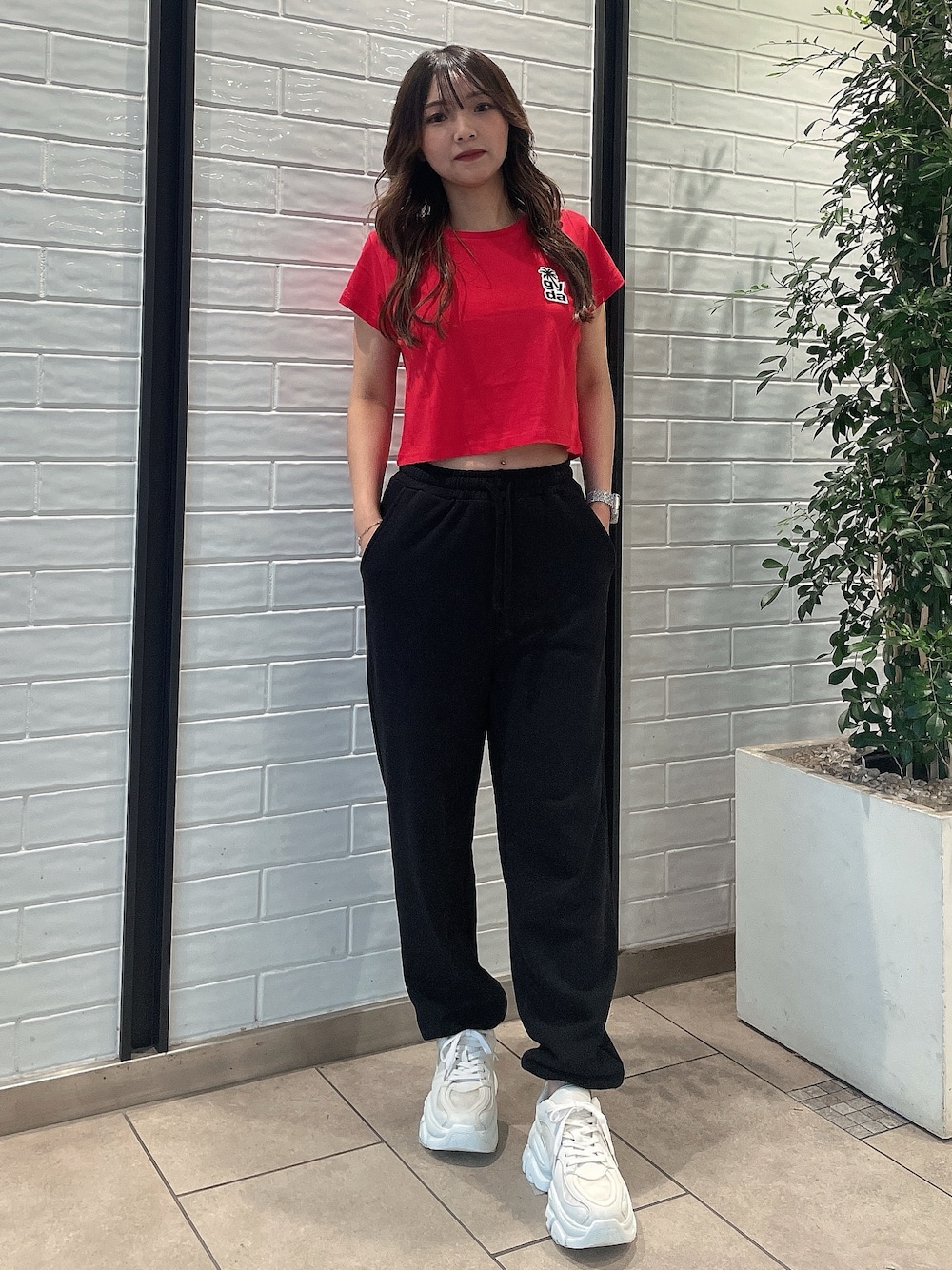 スニーカーコーデ 【トップス】 左胸にgydaのロゴとヤシの木のイラストがポイントのショートTシャツです。 シルエットはタイトではなくゆったりめで着用しやすかったです! 【パンツ】 シンプルなスウェットパンツですが後ろポケットにgydaのロゴとヤシの木のイラストが入っています! 裾はゴムで絞られているので低身長さんでもご着用いただけます♡ 【スニーカー】 シンプルなデザインのスニーカーです。程よい厚底で後ろにはgydaのロゴが入っているのもポイントです。155センチmTVサイズ着用。