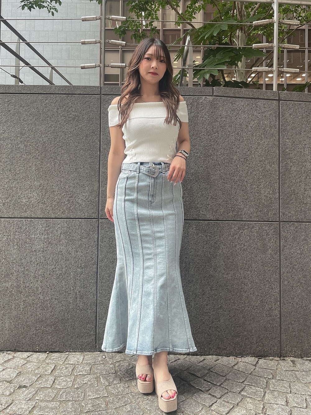 arisa(GYDA)のデニムスカート「ハイウエストバックルベルトデザインマーメイドスカート」を使ったコーディネート