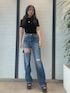 デニムコーデ 【トップス】 square gydaロゴのmoldニットトップスです。ロゴの部分は露出面積もひろすぎずシンプルなデザインなのでたくさん着回しができるトップスです。ニットですが薄手なので夏でも涼しくきれます! 【デニム】 GYDAならではの大胆なダメージが入ったワイドデニムです。サイズ感は大きめで低身長の方は裾を折り曲げて履くかスニーカー合わせで裾をする感じで着用しても可愛いです!155センチSサイズ着用。 【サンダル】 厚底のサンダルでシンプルなデザインなのでどんなコーデ合わせもおすすめです。ヒール自体は高めですが前後の高低差ない厚底のデザインなので長時間履いても足が疲れにくいのでオススメです。155センチMサイズ着用