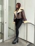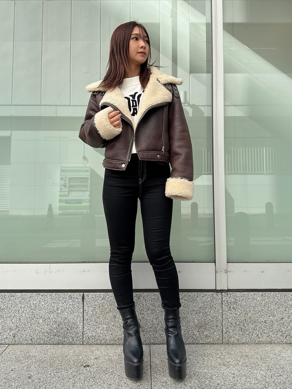 カジュアルコーデ 【アウター】 ムートンボアジャケットです。襟が大きめなので小顔効果も抜群、デザイン性もあるので冬に羽織ると華やかなコーデに仕上がります。オーバーサイズなのでニットも中に着れて、軽いので長時間羽織っていで疲れにくいです。 【トップス】 真ん中にsymmetry GYDAのロゴが大きく入っているニットトップスです。厚すぎない生地なので今は1枚、冬はアウターを羽織れるので万能使いできる1枚です。 【デニム】 大人気ワンウォッシュスキニーデニムです。ストレッチが効いていて柔らかく履きやすいです。硬いデニムが苦手な方にもオススメ♡ 締め付けてくれるので美脚効果も抜群でダメージも入っていないのでデイリー使いできる万能デニムです。155㎝XS着用 【ブーツ】 毎年人気のシンプルな厚底ブーツです。 シンプルなデザインなのでどんなコーデにも合わせやすく厚底なので歩きやすいです。23.5センチMサイズ着用