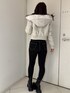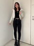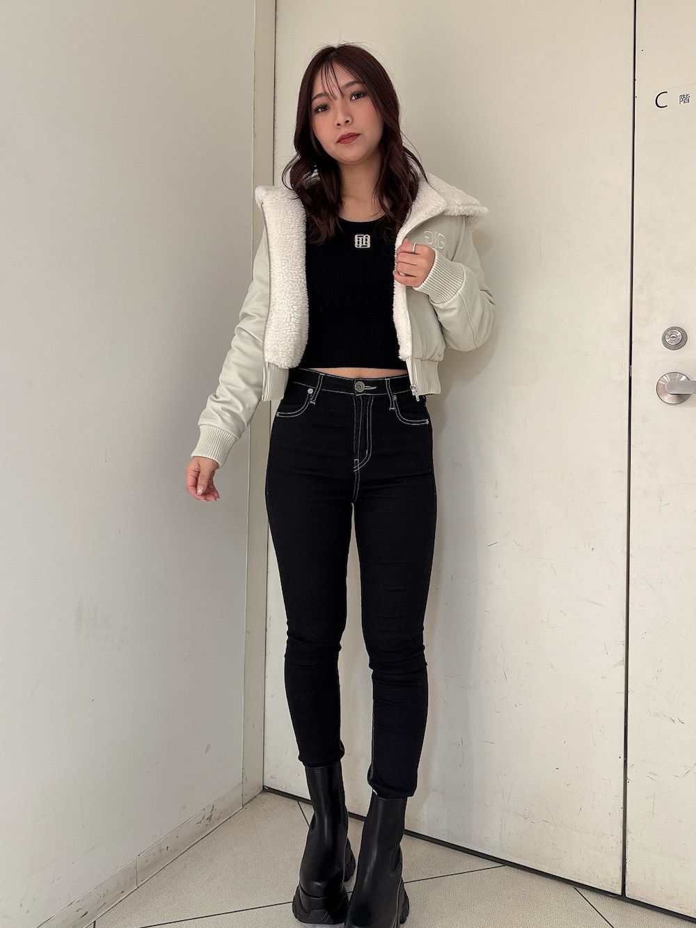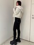 【アウター】 ボアのレザージャケットです。フードが大きめについているのもポイントです。左胸にさりげなくsymmetry GYDAのロゴも入っています。タイトシルエットなのでインナーは薄手のニット合わせがおすすめです。 【デニム】 大人気ワンウォッシュスキニーデニムです。ストレッチが効いていて柔らかく履きやすいです。硬いデニムが苦手な方にもオススメ♡ 締め付けてくれるので美脚効果も抜群でダメージも入っていないのでデイリー使いできる万能デニムです。155㎝XS着用 【ブーツ】 サイドゴアのトレンドのスニーカーブーツです。 ヒールもなく厚底なので安定感があり歩きやすく疲れにくいのでおすすめです!23.5センチMサイズ着用。
