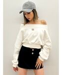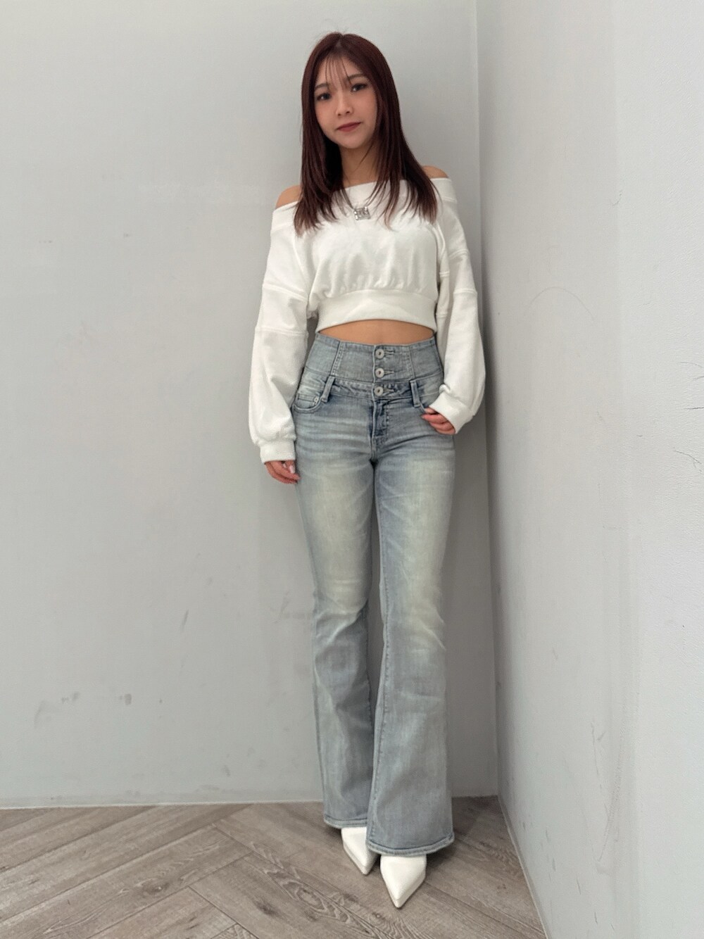 【トップス】 GYGYロゴプレートがついているオフショルトップスです。オフショルなのでカジュアルになりすぎず、キレイ目コーデにもおすすめです。 【デニム】 ウエストクロスデニムシリーズのフレアデニムです。程よいフレアの形なので足長効果抜群です。丈も長すぎないので低身長の方もスニーカー合わせで履けます。155センチSサイズ着用 【ミュール】 定番のポインテッドミュールのソール部分に厚みが出たため、より歩きやすくなりました!シンプルでどんなコーデにも使えます。 23.5センチSサイズ着用
