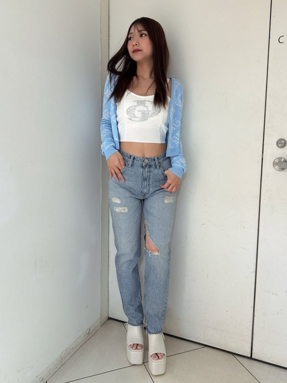 【カーディガン】 GYDAロゴがポイントのサマーニットカーディガンです。サマーニットなので夏の羽織にピッタリです。ワンピースコーデに羽織るのもオススメ。 【ビスチェ】 パット付きのビスチェです。大きく入っているラインストーンでGDロゴがポイント。スキニー・フレア・ワイドなどどんなシルエットのデニムにも合います。 【デニム】 ダメージ入りのストレートパンツです。ストレートデニムなので広がりすぎず、スキニーのピッタリ感が苦手な方にもオススメ。綺麗目コーデに仕上がります。155センチSサイズ着用。 【サンダル】 毎年大人気のチャンキーサンダルです。ヒールは高いですが前後差がないため疲れにくく太めのヒールで安定感もあり歩きやすいです。23.5センチSサイズ着用。