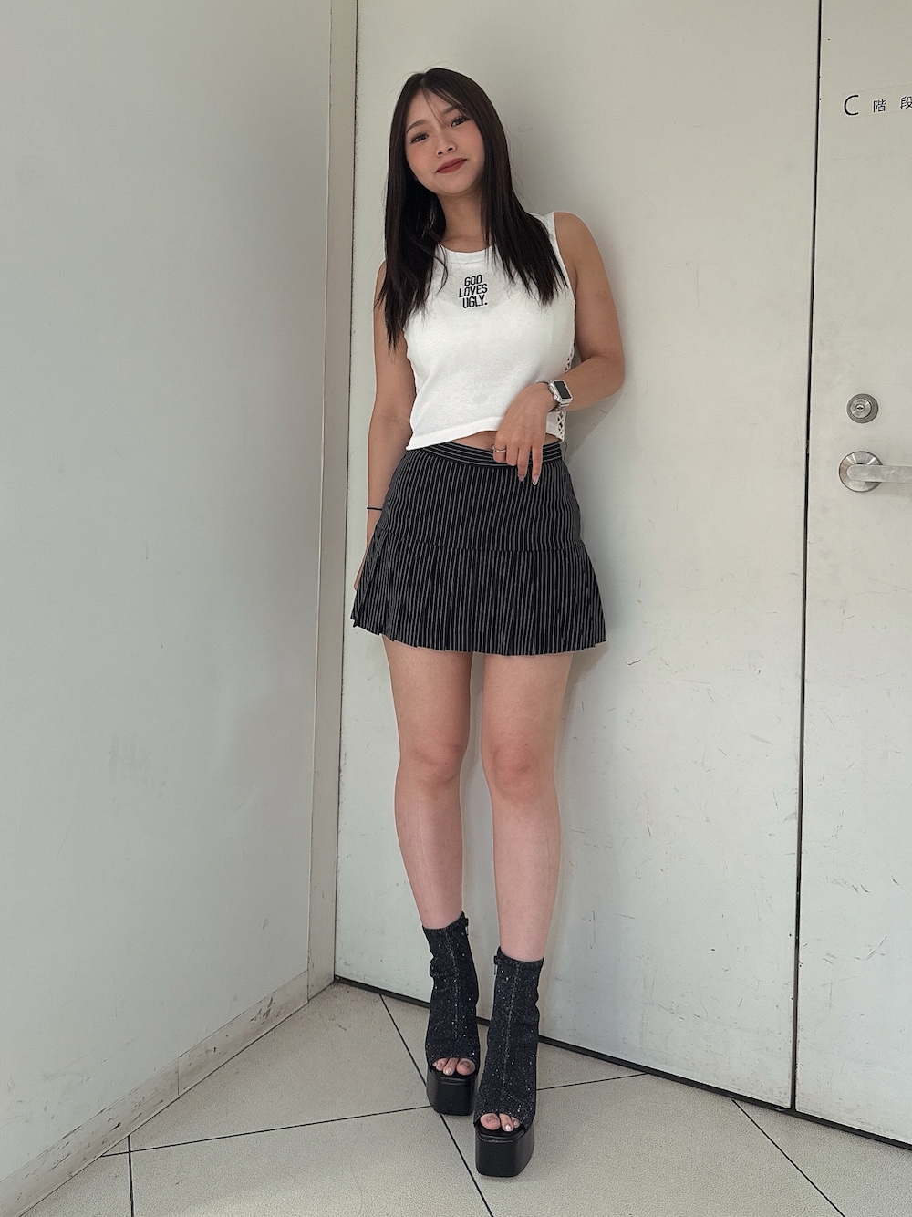 【トップス】 サイドがレースアップになっているノースリーブトップスです。サイドの肌見せがあるのでカラー物のビスチェをレイヤードするのもオシャレ見えにできます。 【スカート】 プリーツスカートです。インナーパンツ付きで細身のストライプ柄なので足長効果もあります! ビックTシャツを合わせるのも🙆🏽♀️ 【ブーツ】 かかととつま先が空いているブーツで春・夏・秋と長いシーズンで使えるブーツです。足出しコーデはもちろんワイドデニムやフレアデニムとの相性も抜群です。23.5センチSサイズ着用。