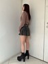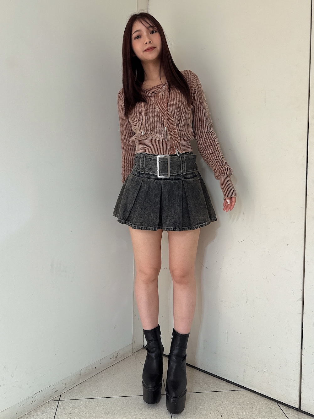 【トップス】 フロントレースアップデザインのブリーチニットです。フロントデザインがあるのでシンプルなデニム合わせもおすすめです✨ 【スカート】 ベルト付きのデニムプリーツスカートです。プリーツスカートのかわいらしさとデニムのカジュアルさが合わさったデニムスカートなので普段スカート履かない方でも使いやすいスカートです!155センチSサイズ着用 【ブーツ】 毎年人気のシンプルな厚底ブーツです。 シンプルなデザインなのでどんなコーデにも合わせやすく厚底なので歩きやすいです。23.5センチMサイズ着用