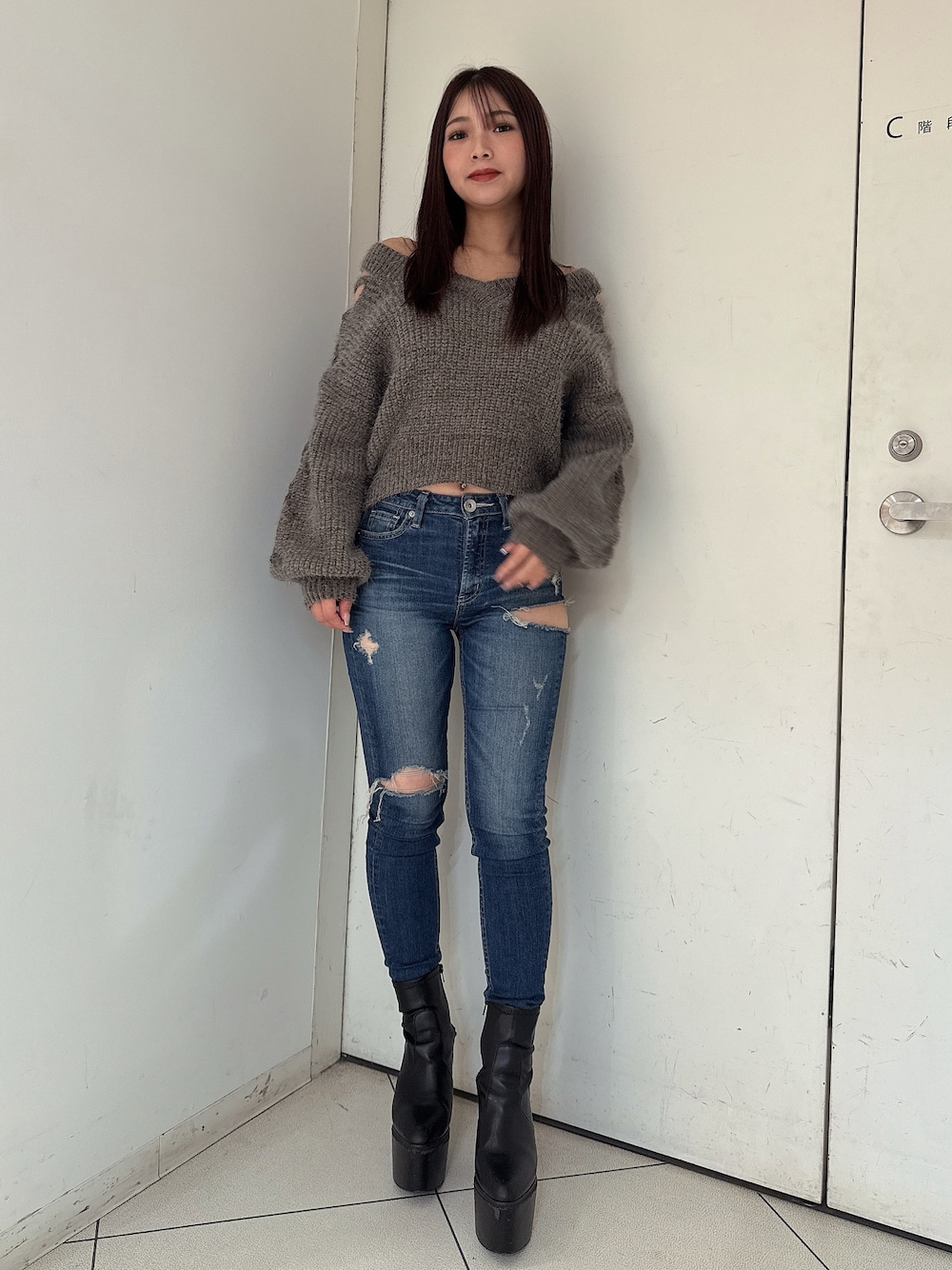 【トップス】 肩がレースアップデザインになっているシャギーニットトップスです。さりげない肌見せがgydaならではのデザインです♥ 【デニム】 大人気のSIDE RIPPEDスキニーデニムパンツです。太ももダメージがポイントです! 国産デニムなので履けば履くほど柔らかかくなり履きやすくなります。155㎝Sサイズ着用。 【ブーツ】 毎年人気のシンプルな厚底ブーツです。 シンプルなデザインなのでどんなコーデにも合わせやすく厚底なので歩きやすいです。23.5センチMサイズ着用