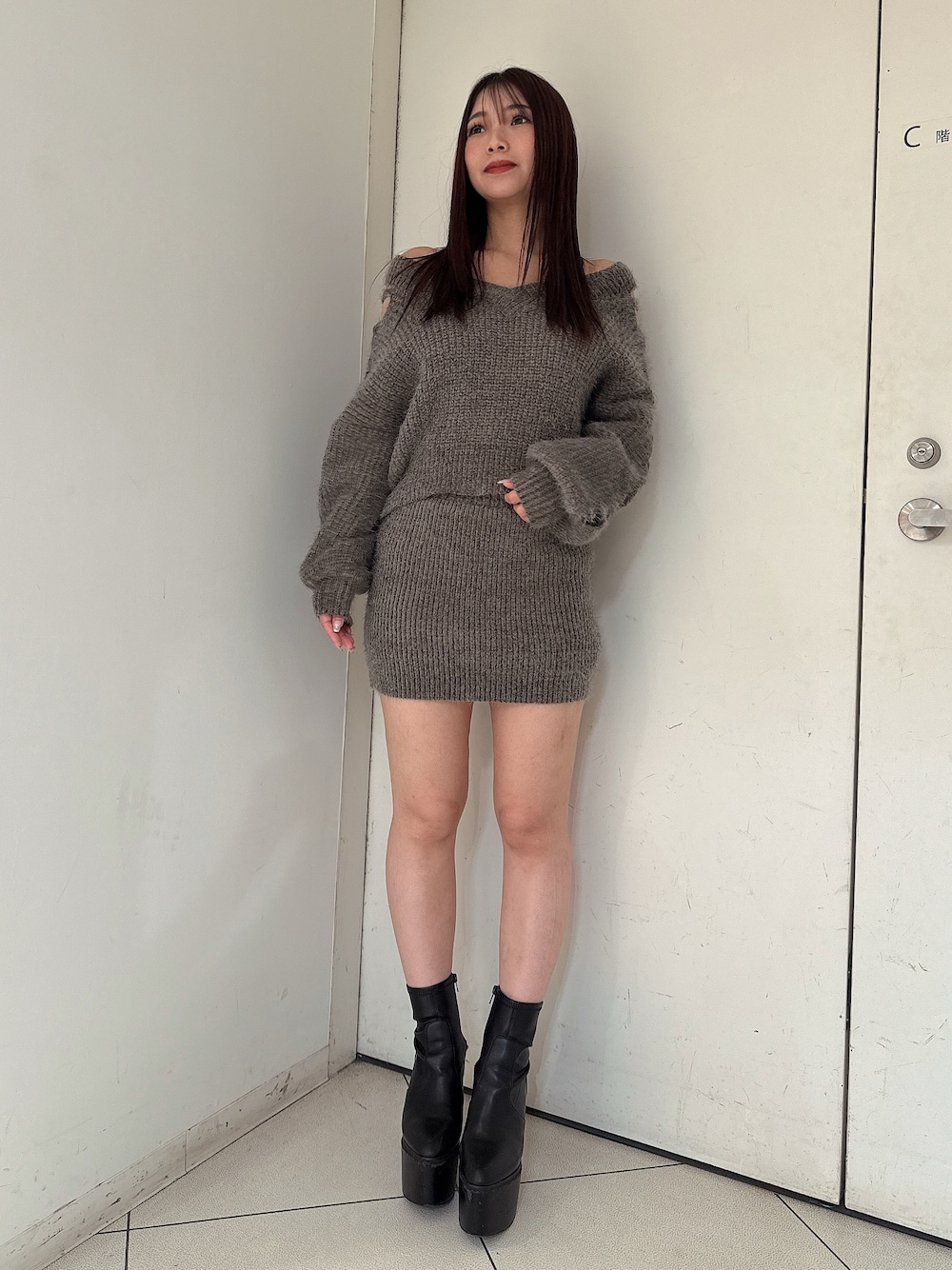【トップス】 肩がレースアップデザインになっているシャギーニットトップスです。さりげない肌見せがgydaならではのデザインです♥ 【スカート】 シャギー素材のニットスカートです。インナーパンツ付きで1枚で着用可🙆🏽♀️ 【ブーツ】 毎年人気のシンプルな厚底ブーツです。 シンプルなデザインなのでどんなコーデにも合わせやすく厚底なので歩きやすいです。23.5センチMサイズ着用