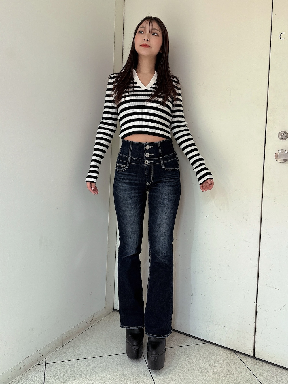 arisa(GYDA)のデニムパンツ「NEWハイウエストBACKクロスフレアパンツ」を使ったコーディネート