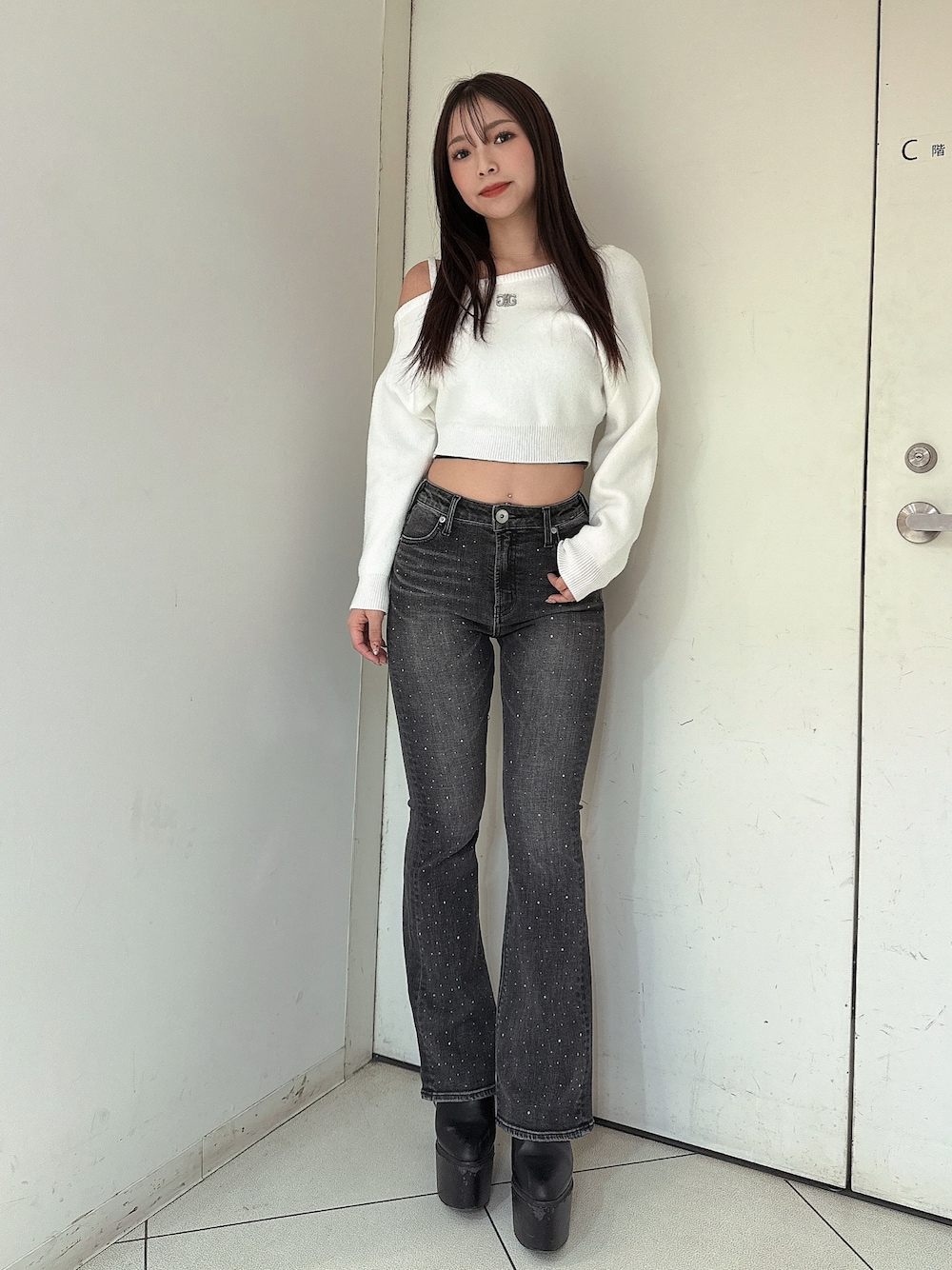 【トップス】 symmetry GYDAロゴ入りのワンショルダーニットです。肩紐がチェーンになっているのでシンプルになりすぎずおしゃれに着こなせます♡ 【デニム】 シンプルなハイウエストフレアデニムの前面に細かいラインストーンが着いているため歩くたびにキラキラなるデニムです。シンプルなトップス一枚合わせても華やかに着こなせます。155センチ Sサイズ着用。 【ブーツ】 毎年人気のシンプルな厚底ブーツです。 シンプルなデザインなのでどんなコーデにも合わせやすく厚底なので歩きやすいです。23.5センチMサイズ着用