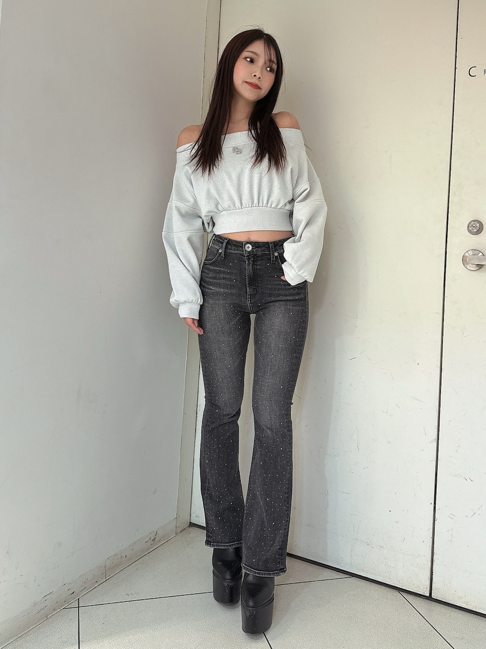 【トップス】 真ん中にGGロゴのプレート付きのオフショルトップスです。シンプルなのでどんなボトムス合わせもオススメです○ オフショルですがスウェット素材なので綺麗目すぎずカジュアルに合わせていただけます! 【デニム】 シンプルなハイウエストフレアデニムの前面に細かいラインストーンが着いているため歩くたびにキラキラなるデニムです。シンプルなトップス一枚合わせても華やかに着こなせます。155センチ Sサイズ着用。 【ブーツ】 毎年人気のシンプルな厚底ブーツです。 シンプルなデザインなのでどんなコーデにも合わせやすく厚底なので歩きやすいです。23.5センチMサイズ着用