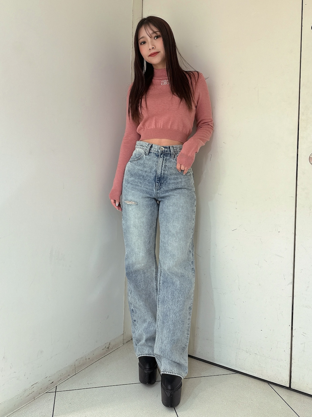 【トップス】 真ん中にsymmetry GYDAロゴがさりげなく刺繍されているラメニットトップスです。さりげなくラメが入っている素材のためシンプルでも華やかに着こなせます✨ 【デニム】 後ろのウエストがレースアップデザインになっているストレートデニムです。程よいストレートシルエットでハイウエストのためショート丈トップス合わせがおすすめです♡155センチMサイズ着用。ダボっとしたシルエットで履きたい方はMサイズ着用がおすすめです。 【ブーツ】 毎年人気のシンプルな厚底ブーツです。 シンプルなデザインなのでどんなコーデにも合わせやすく厚底なので歩きやすいです。23.5センチMサイズ着用
