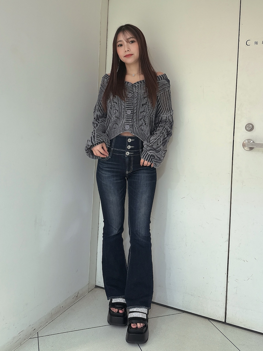 【トップス】 毎年大人気の前後2WAYで着れるニットトップスです。ブリーチ加工がカジュアルに着こなしてくれて、前がボタンになっているので少し肌寒くなった季節のカーディガンとしても使える万能アイテムです。 【デニム】 ウエストクロスデニムシリーズのフレアデニムです。程よいフレアの形なので足長効果抜群です。丈も長すぎないので低身長の方もスニーカー合わせで履けます。155センチSサイズ着用 【サンダル】 去年大人気だった厚底サンダルにビジューがついて再登場です♡ 厚底で歩きやくす疲れにくい作りになっており春夏大活躍するアイテムです!23.5センチMサイズ着用。
