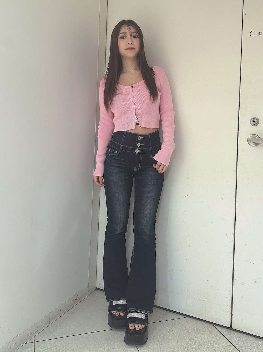 arisa(GYDA)のデニムパンツ「ハイウエストBACKクロスフレアパンツ」を使ったコーディネート