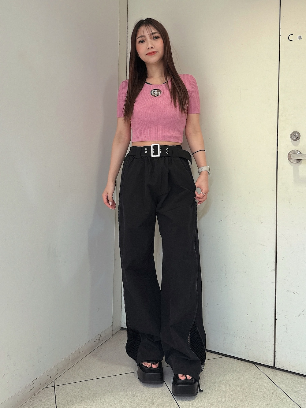 【トップス】 大人気のbijou moldシリーズです。今季はGGロゴになっておりインナー使いはもちろん夏にトップスとして一枚での着用もおすすめです。 【パンツ】 ベルト付きのワイドパンツです。丈は155センチで厚底サンダル合わせだとちょうどいい丈です。 サイドにファスナーがあり開けると中にメッシュ素材がレイヤードされているのもポイントです! 【サンダル】 去年大人気だった厚底サンダルにビジューがついて再登場です♡ 厚底で歩きやくす疲れにくい作りになっており春夏大活躍するアイテムです!23.5センチMサイズ着用。