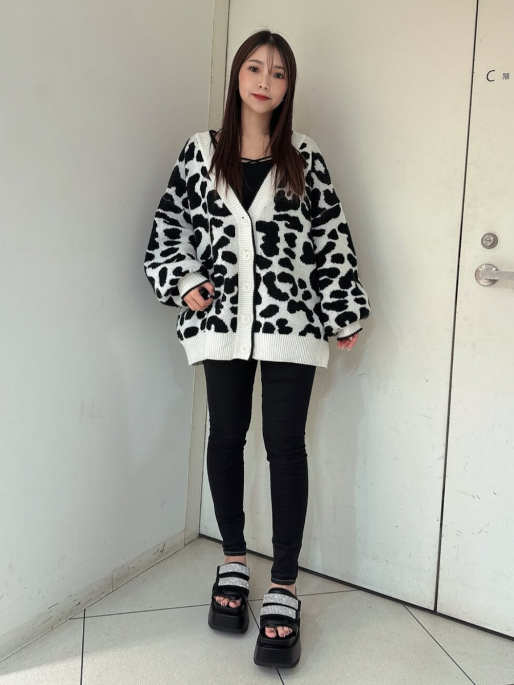 【カーディガン】 レオパード柄のオーバーニットカーディガンです。レオパード柄はさりげなくラメが入っており一枚羽織ると華やかなコーデになります。 【デニム】 大人気ワンウォッシュスキニーデニムです。ストレッチが効いていて柔らかく履きやすいです。硬いデニムが苦手な方にもオススメ♡ 締め付けてくれるので美脚効果も抜群でダメージも入っていないのでデイリー使いできる万能デニムです。155㎝XS着用 【サンダル】 去年大人気だった厚底サンダルにビジューがついて再登場です♡ 厚底で歩きやくす疲れにくい作りになっており春夏大活躍するアイテムです!23.5センチMサイズ着用。
