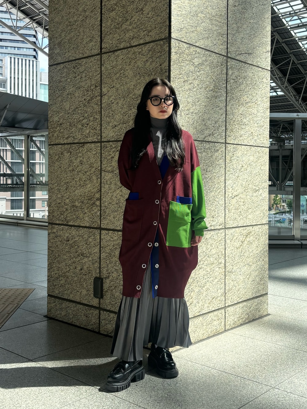 【カーディガン】UN3D.デビューシーズンからの定番アイテムから今季らしいカラーが登場! 落ち着いたボルドーをベースにグリーンが効いていて可愛いカラーリング。 フロントのテープがブルーなので、開けた時と閉めた時の雰囲気が変わります◎ 大きめのサイズ感がサクッと羽織るだけでモードに見せてくれる楽ちんアイテム✨ 【スカート】UN3D.のブランドアイコンのプリーツスカート。 落ち着いたグレーで、大人きれいに着られるカラーです。 手作業で表現された複雑なプリーツが施されているので、動きが特徴的です。 腰でラインを拾いすぎず、縦のラインがしっかりキレイに出るのがポイントです◎