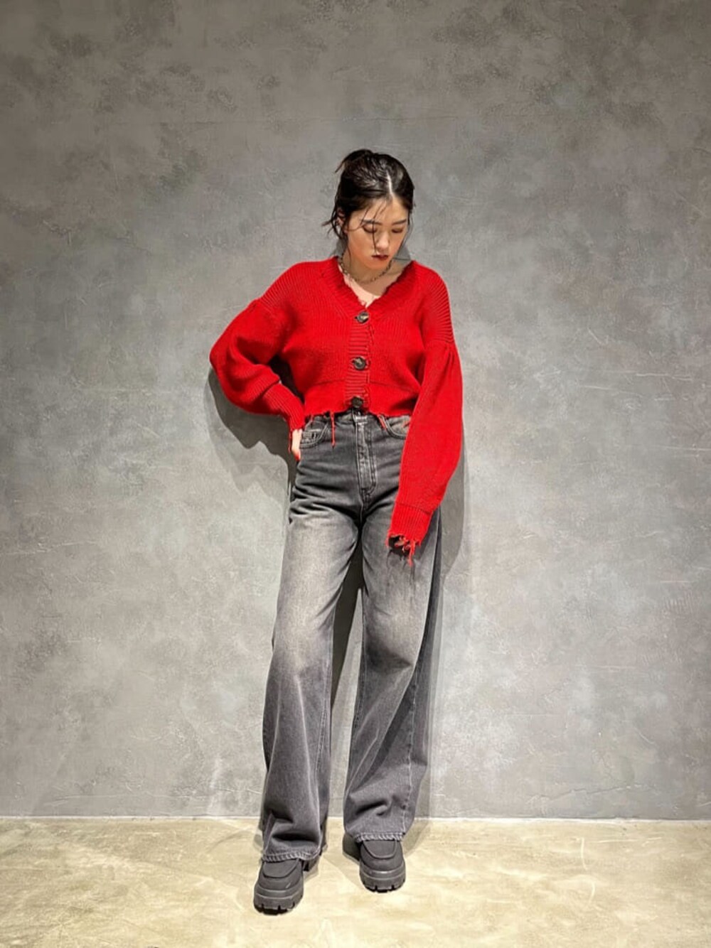 「カラーカジュアルコーデ」 [トップス]厚めのニット素材です!ショート丈でおへそより上の丈間でした! [デニム]身長165㎝でSサイズ着用しています! ダボっとルーズに着ていただくのがオススメです![シューズ]普段24.5㎝でLサイズ着用しています!
