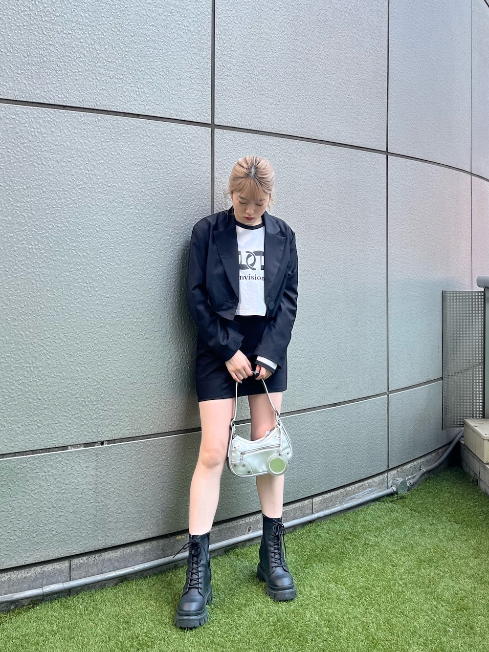 『カジュアルセットアップ風コーデ☺︎』 [ジャケット]おへそにかかるくらいのショート丈です!裾がクラッシュ加工になっているので綺麗すぎず普段使いしやすいデザインになっています! [スカート]身長165㎝でSサイズ着用しています!中にインナーショーツが付いているので一枚で履いていただけます! [ロンT]EMODAオリジナルのロゴがプリントされていて1枚でも映えるアイテムです!おへそ上のショート丈です! [ブーツ]普段24.5㎝でLサイズ着用しています! [バック]500mlのペットボトルが横に入る大きさです!