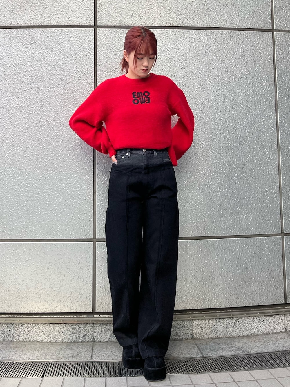 片岡玲菜(EMODA)のニット/セーター「ジャガードロゴニット」を使ったコーディネート